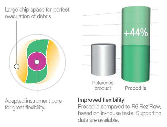 Thanks to the innovative, variably-tapered file core, the chip space of the Procodile files is increased by up to 12 %*. Infected tissue is removed even more efficiently from the root canal thereby allowing for optimum preparation time.