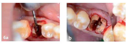 Use of the surgical bur to separate the mesial roots from the distal root. Very short treatment time to ensure preservation of the vestibular and lingual cortical bone. Depending on the clinical situation, a flap might be recommended as a visible opening to the root furcation.