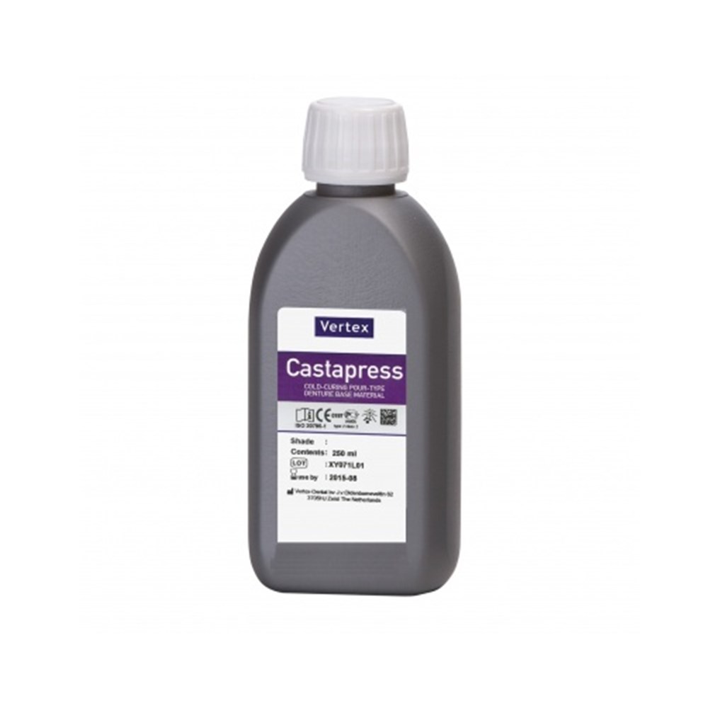 Vertex Castapress is a self polymerizing pouring/casting type denture base material also suitable for repair, relining, rebasing and extensions of partial dentures. Pouring time (at 22 ° C) up to 3 minutes Dough time (at 22° C) 6 minutes Curing time 30 minutes at 55°C and 2.5 bar Liquid 250ml
