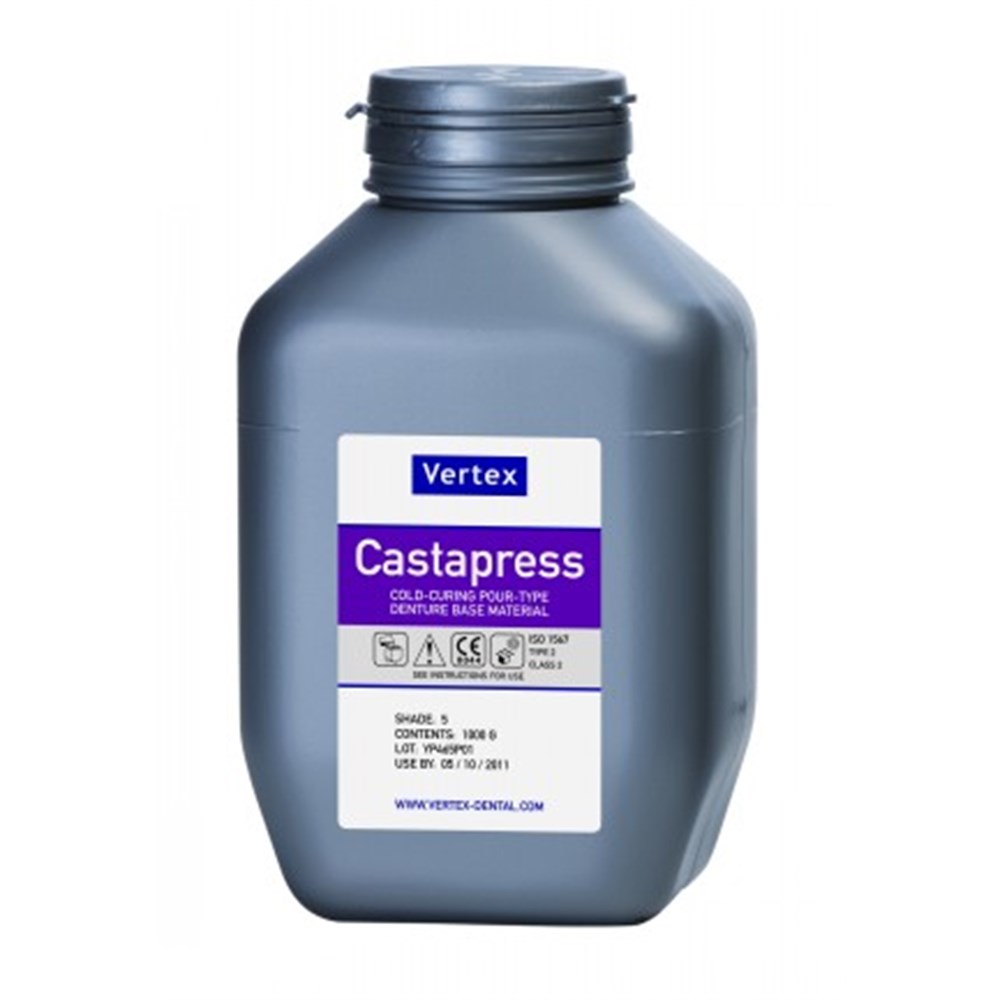 Vertex Castapress is a self polymerizing pouring/casting type denture base material also suitable for repair, relining, rebasing and extensions of partial dentures. Pouring time (at 22 ° C) up to 3 minutes Dough time (at 22° C) 6 minutes Curing time 30 minutes at 55°C and 2.5 bar Powder 1000g Shade 4 Clear