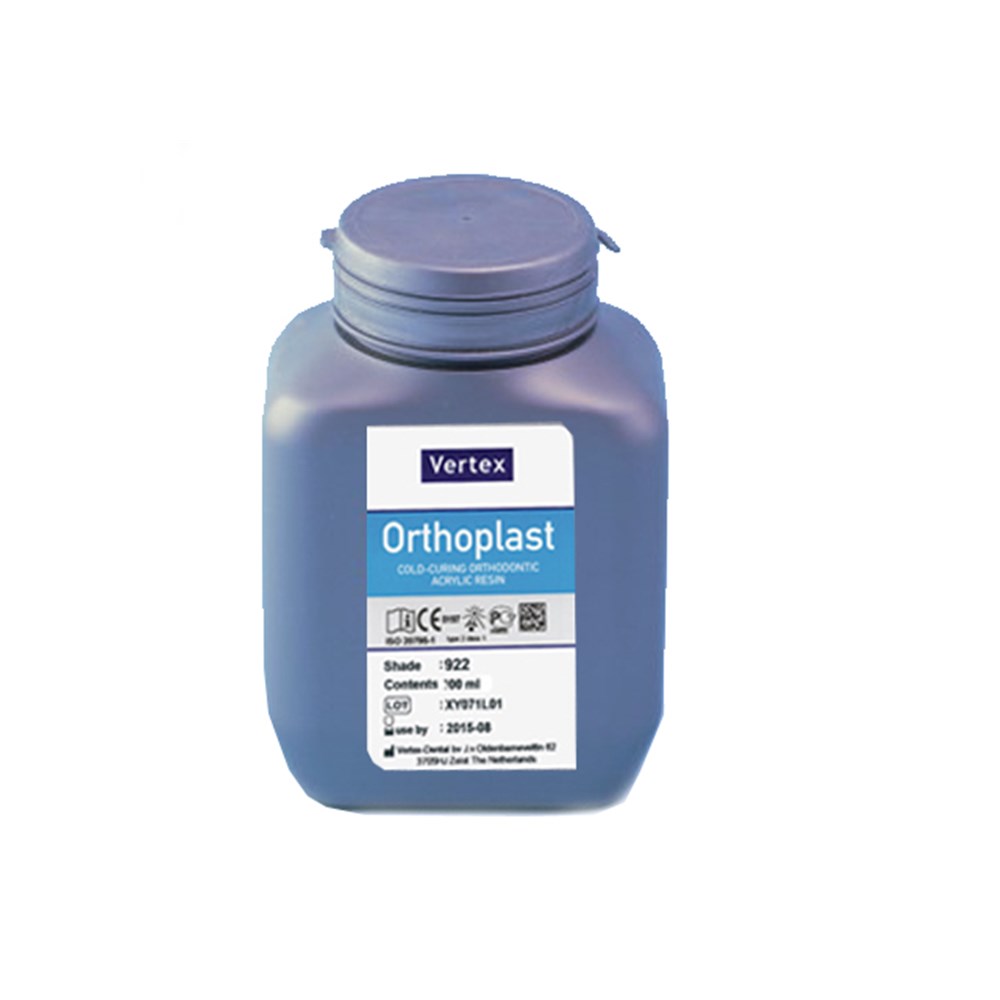 Vertex Orthoplast is a self polymerizing acrylic for orthodontic appliances. Its unique grain structure makes this acrylic suitable for the spray-on technique. Pouring time (at 22 ° C) 9 minutes Dough time (at 22° C) 6 minutes Curing time 20 minutes at 55°C and 2.5 bar