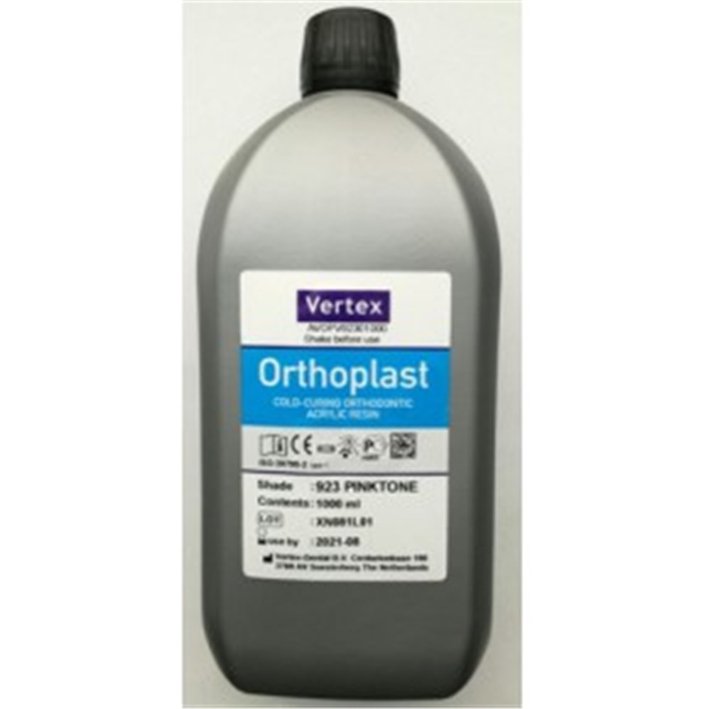 Vertex Orthoplast is a self polymerizing acrylic for orthodontic appliances. Its unique grain structure makes this acrylic suitable for the spray-on technique.. Pouring time (at 22 ° C) 9 minutes. Dough time (at 22° C) 6 minutes. Curing time 20 minutes at 55°C and 2.5 bar