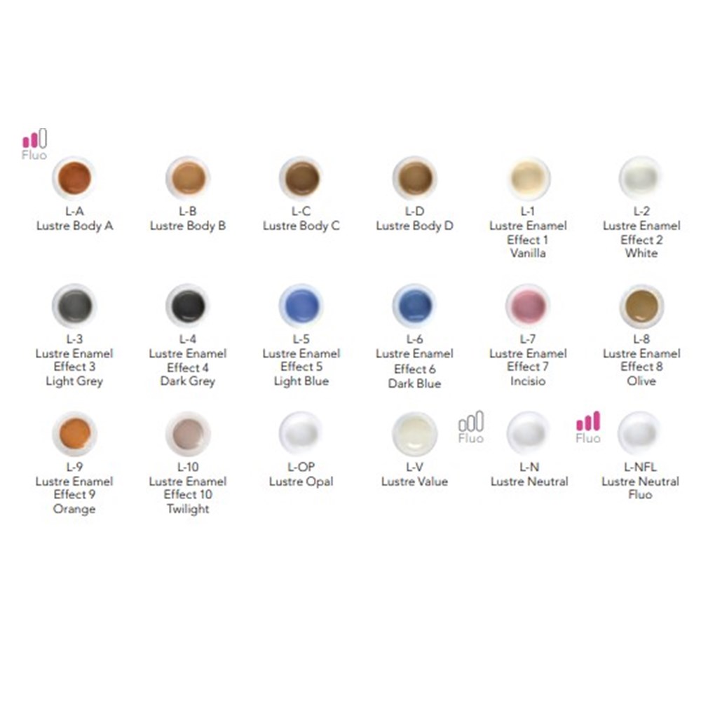 The Lustre Pastes ONE are specially developed to boost the fluorescence of monolithic restorations. Fluorescence can be boosted with Lustre Neutral FLUO (L-NFL).