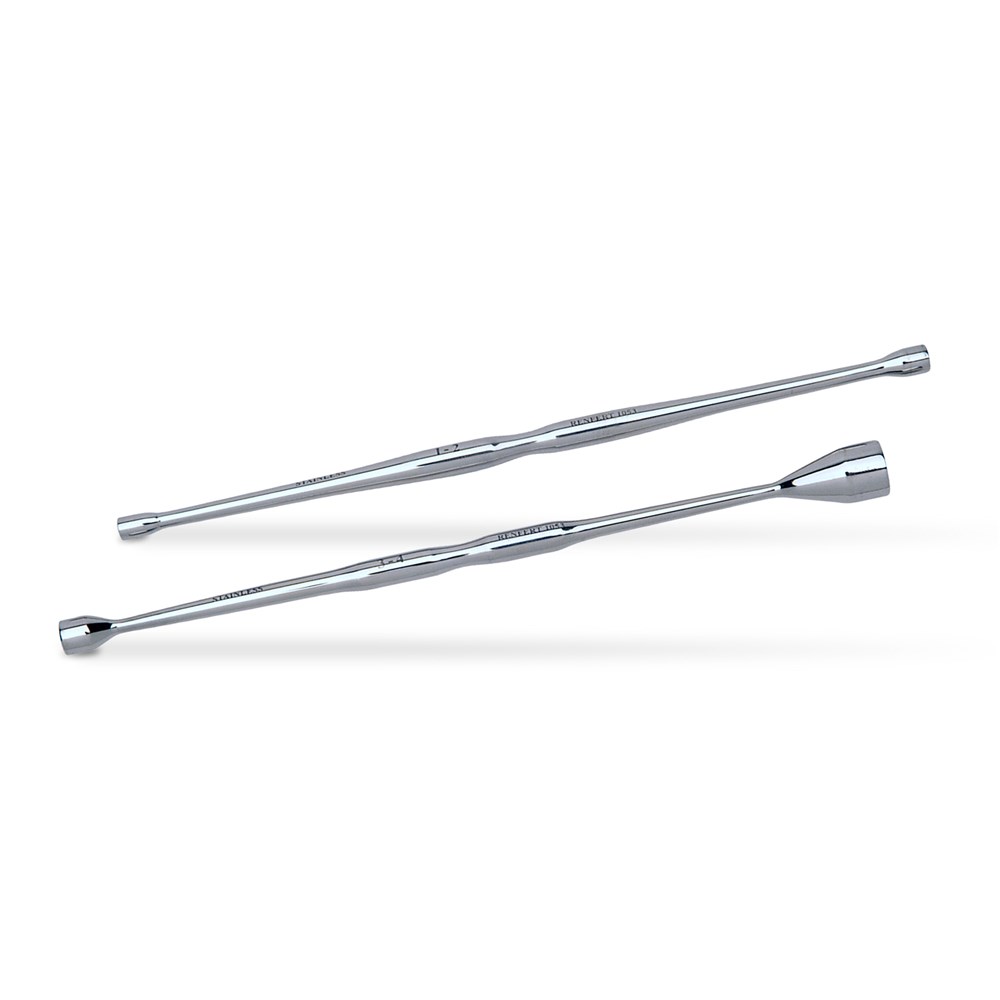 Stainless steel metrical scoops for precise measuring of porcelain powders.