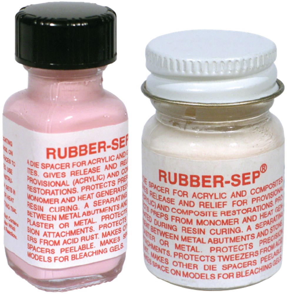 Rubber Sep is a latex liquid that creates a peelable film. It is a die spacer, release agent and separator for acrylic and composite resin restorations. Paint a thin coat onto a preparation and let it dry which takes a few minutes. The pink Rubber Sep dries translucent red and white Rubber Sep dries clear. The prep now has a 12 micron coating that allows the resin to cure onto the surface, making the cured resin easier to remove.