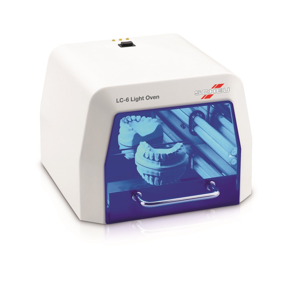 High-capacity light polymerisation unit for up to 4 models and fixator. Its inner dimensions of 170 x 160 x 120 mm (W x D x H) offer enough space for articulated and mounted models. Six fluorescent light tubes (3 UVA and 3 blue light tubes) and an aluminium reflector guarantee homogeneous illumination. Two polymerisation times of 5 and 10 minutes are already pre-set in accordance with the light-curing DURASPLINT® LC material. Continuous operation can also be set. Spectral range of the light curing device between 350 and 450 nm. Auto start function for easier application.