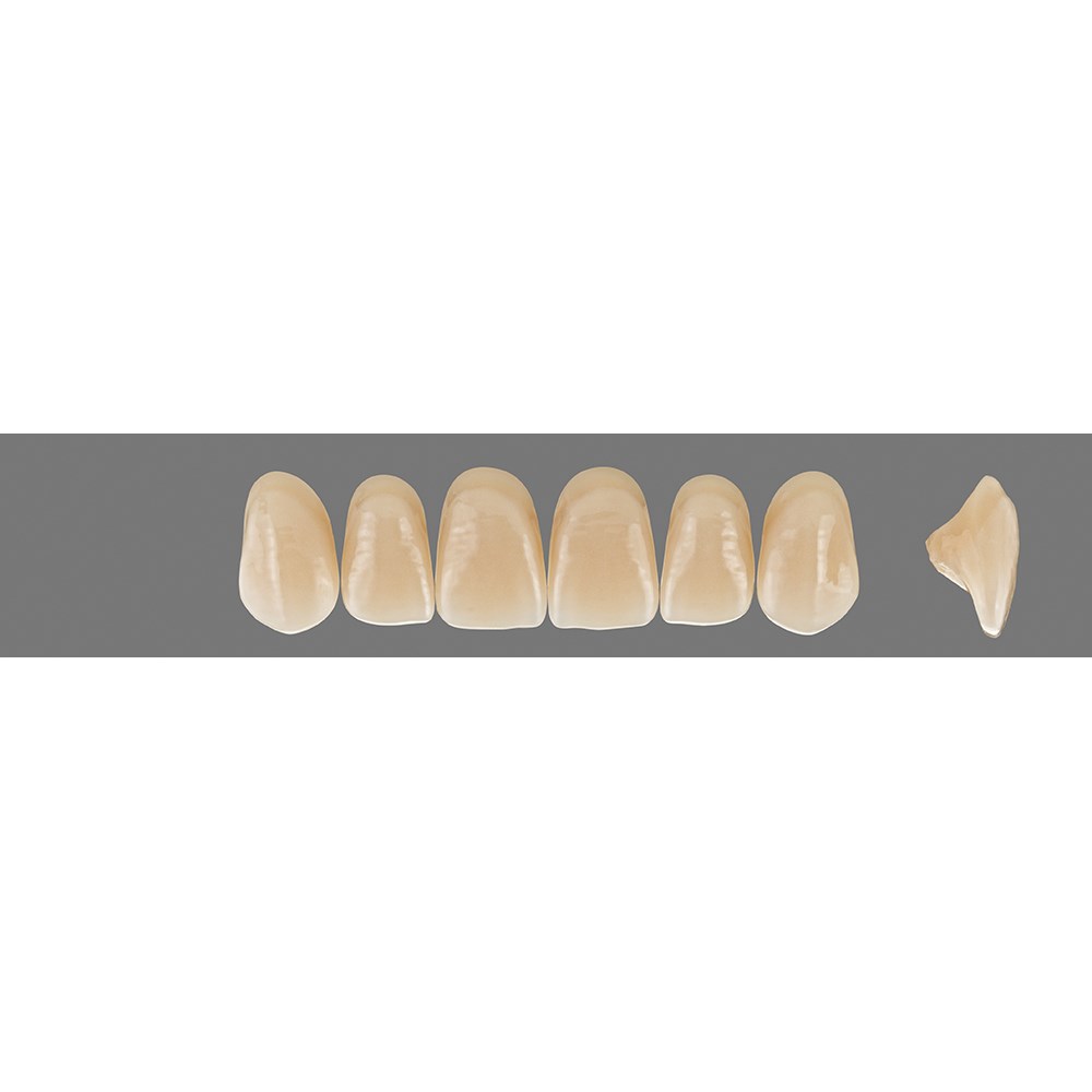 Basic anterior teeth made of HC polymer with multifunctional occlusal surfaces.
