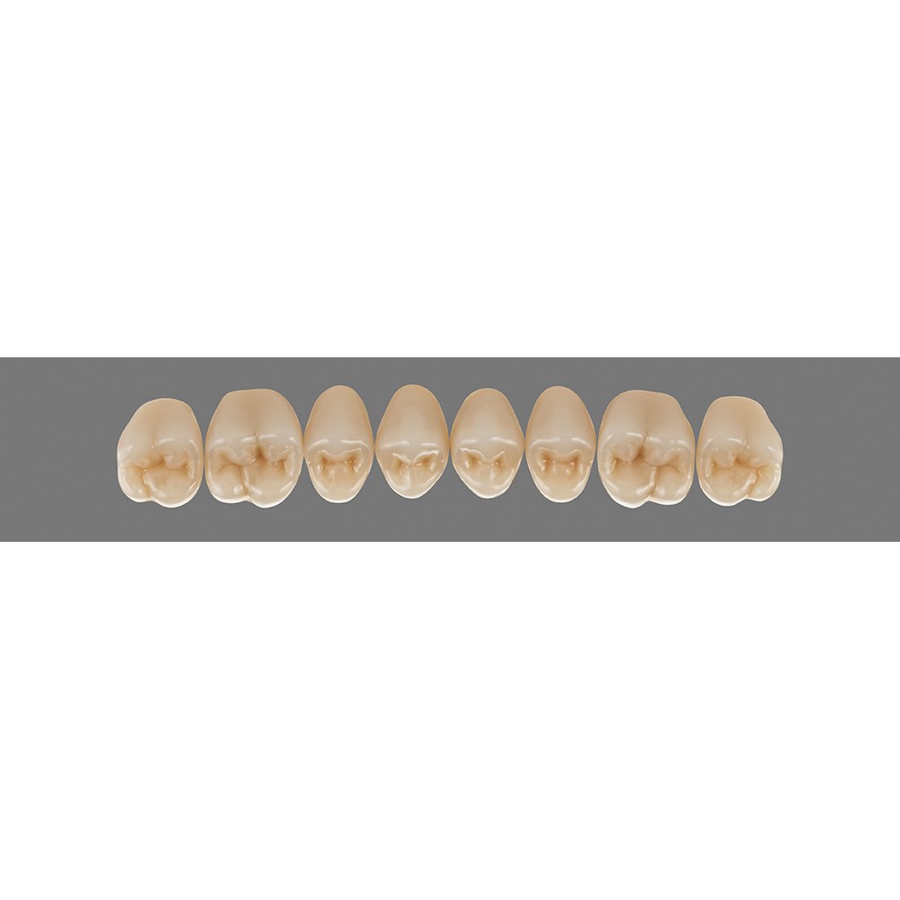 Basic posterior teeth made of HC polymer with multifunctional occlusal surfaces.