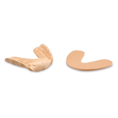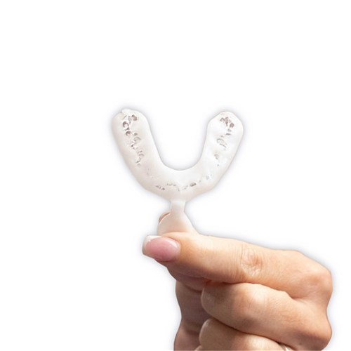 Thermoplastic occlusion trainer for condylar reposition after wearing protrusion splints during the night. The AM Aligner is heated and adapted to the patient's upper jaw by the clinician.