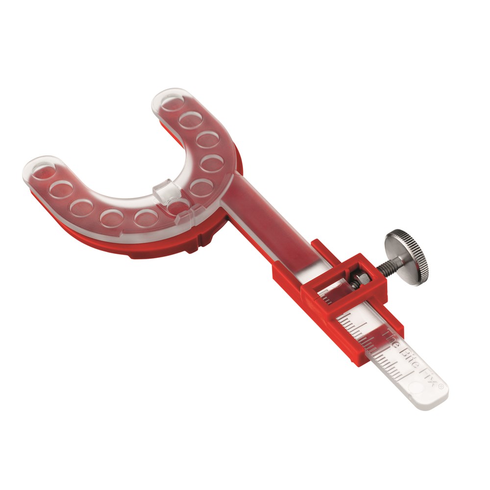 Bite registration with reusable holder made of sterilizable plastic for the simple and precise registration of construction bites in anti-snoring therapy. The decentralized handle assures easy midline control and comes with fixing screw and mm-scale for control of protrusion adjustment.