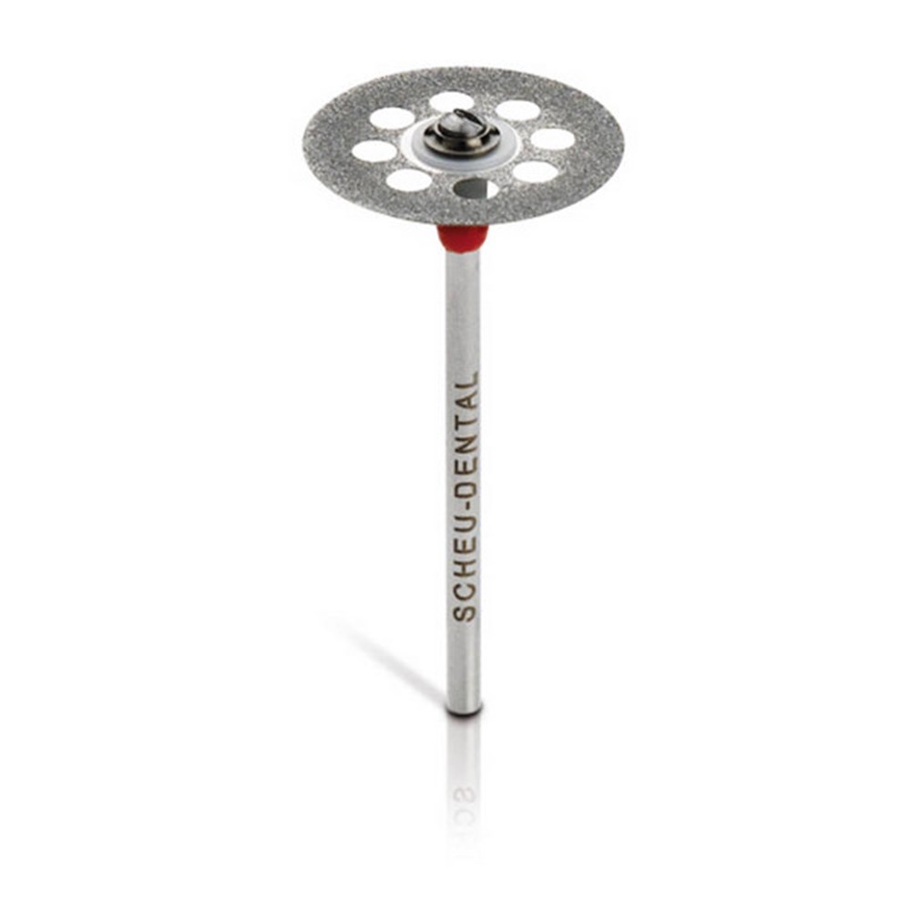 Diamond coated on both sides (thickness 0.28 mm) for very precise saw cuts on set-up models and for finishing splints. Mounted on mandrel, Ø 22 mm.
