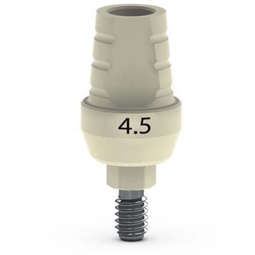 Use for table top or intra-oral scanning. May also be used for fabrication of cement- or screw-retained provisional restorations (up to 30 days). Packaged with an abutment screw (PXAS). PEEK (PolyEtherEtherKetone) material. Final torque: 30 Ncm. Note: Prior to scanning, verify that the scan abutment is available in the library of the design software that will be used to design the abutment.