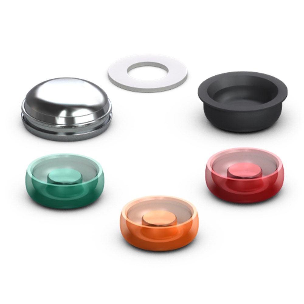 Includes: (10) Denture Caps assembled with Black Processing Males; (10) White Block-out Spacers; (10) Green, (10) Orange and (10) Red Nylon Males.