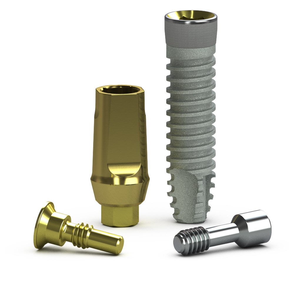 Precision engineered Laser-Lok collar shown to promote oblique connective tissue attachment, much like a natural tooth. Anatomically tapered implant body has proprietary reverse buttress threads with wide flat leading edges for increased surface area and primary stability. Packaged with a multi-purpose esthetic gold-colored 3inOne Abutment, Abutment Screw and Cover Cap. Resorbable Blast Texturing (RBT) roughened titanium alloy. Laser-Lok zone: 1.5mm high; 0.3mm machined collar between the microchannels and the implant/abutment interface. Connection secured with Spiralock® screw technology.