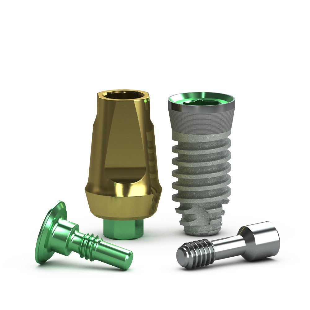 Precision engineered Laser-Lok collar shown to promote oblique connective tissue attachment, much like a natural tooth. Anatomically tapered implant body has proprietary reverse buttress threads with wide flat leading edges for increased surface area and primary stability. Packaged with a multi-purpose esthetic gold-colored 3inOne Abutment, Abutment Screw and Cover Cap. Resorbable Blast Texturing (RBT) roughened titanium alloy. Laser-Lok zone: 1.5mm high; 0.3mm machined collar between the microchannels and the implant/abutment interface. Connection secured with Spiralock® screw technology.