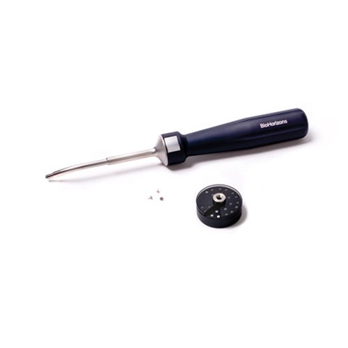 The AutoTac System Kit is used to secure membranes with the push of a button. AutoTac System Starter Kit includes: • Delivery Handle • Autoclavable Titanium Tack Cassette (pre-loaded with 21 Titanium Tacks) • Manual Tack Driver • Forceps • Sterilization Tray with cover