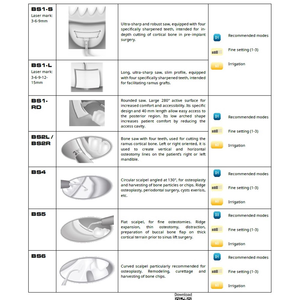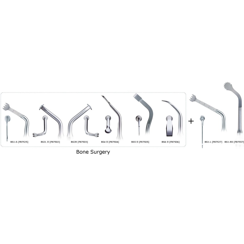 Comprising six ultrasonic tips (three saws and three scalpels) adapted to the different cases that arise in the intraoral environment, the BS Kit is used for clinical treatments such as boneharvesting, crest expansion, preparation of the implant site and accessing the lower alveolar nerve.