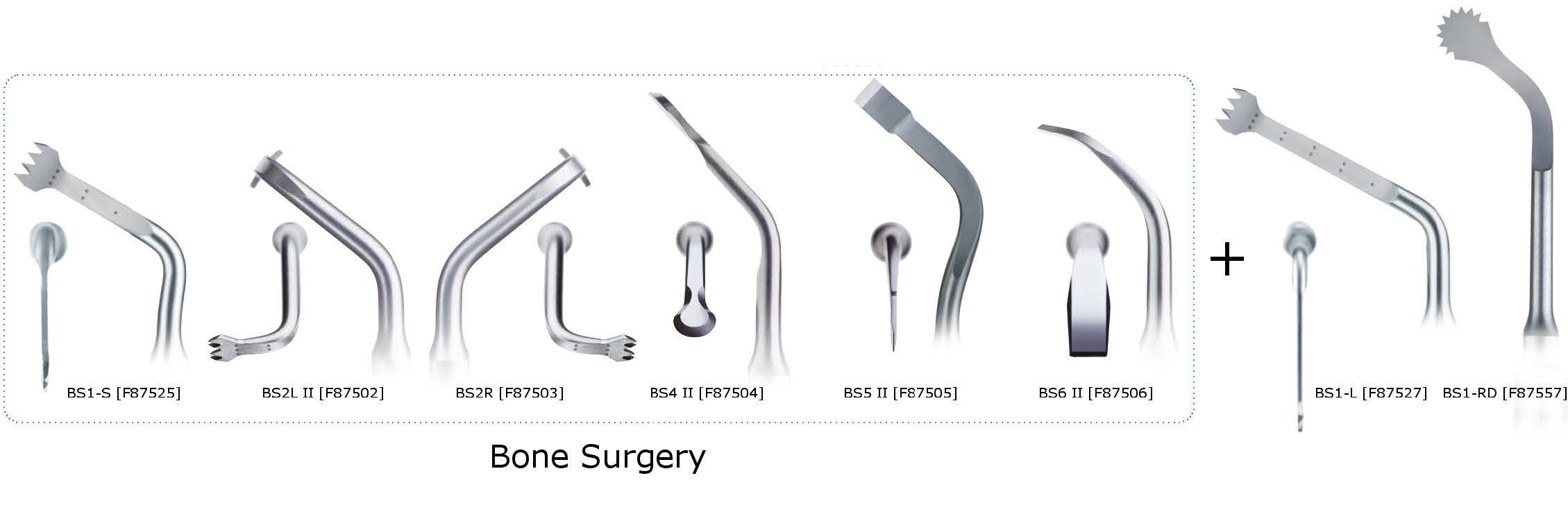 Bone Surgery™ (BS) tips, principally intended for performing bone graft, allow cutting excising and remodeling bone structures without any risk of soft tissue lesions.