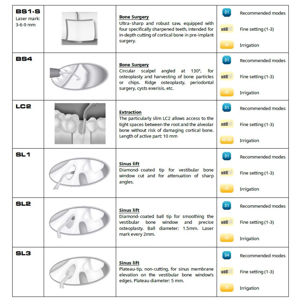 Due to the ultrasonic frequency modulation, a selective cut is achieved in surgical mode. Therefore, these tips limit the risk of soft tissue injury such as gingiva, ligaments, periodontal fibers, and nerves.
