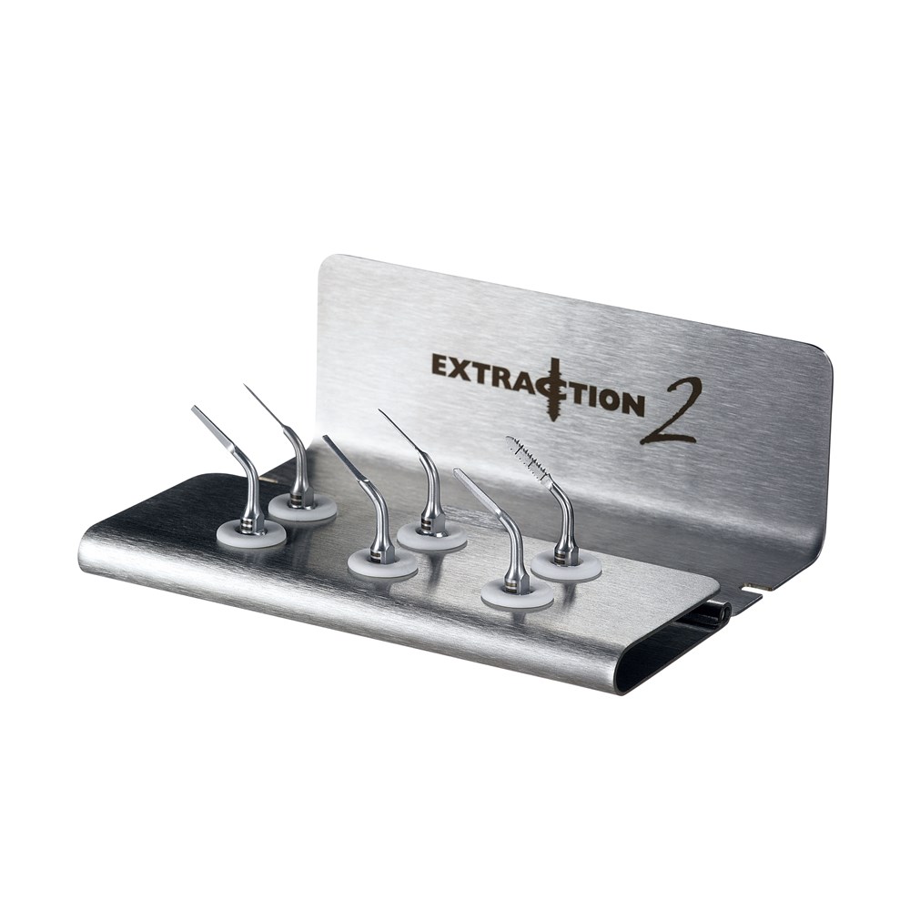 An extraction kit containing Tips - LC1-2, LC2-2 (2), LC2R-2, LC2L2, Ninja-2, Autoclavable Stand and Universal Wrench for atraumatic extractions.