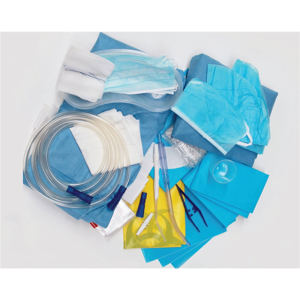Kit contains: 3 x Surgeon Gown Grade A 2 x Face Mask Ear Loop 1 x Face Mask With Ties 2 x Head Covers With Elastic 1 x Head Covers With Ties 4 x Hand Towel 1 x Drape 90cm x 120cm 1 x Drape 75cm x 90cm 1 x U-Drape 100cm x 150cm + Adhesive + Tube Holders 1 x Outer Wrap 180cm x 140cm 3 x Adhesive Film (Blue) 20cm x 20cm 3 x Adhesive Film 5cm x 80cm 1 x Aspiration System With Tip 1 x Blue Adaptor 3 x Drill Sleeves 120cm 1 x Elastic Cap Radio Cover 1 x Galley Pot (Small) 1 x Kidney Dish 4 x Pack of 4 X-Ray Gauze Swab (7.5cm X 7.5cm) 1 x Suction Tube Connector 1 x 3 Metres of Suction Tube 1 x Yellow Bio Hazard Bag For Trash 1 x Yankuer Fine 1 x Plastic Tweezers