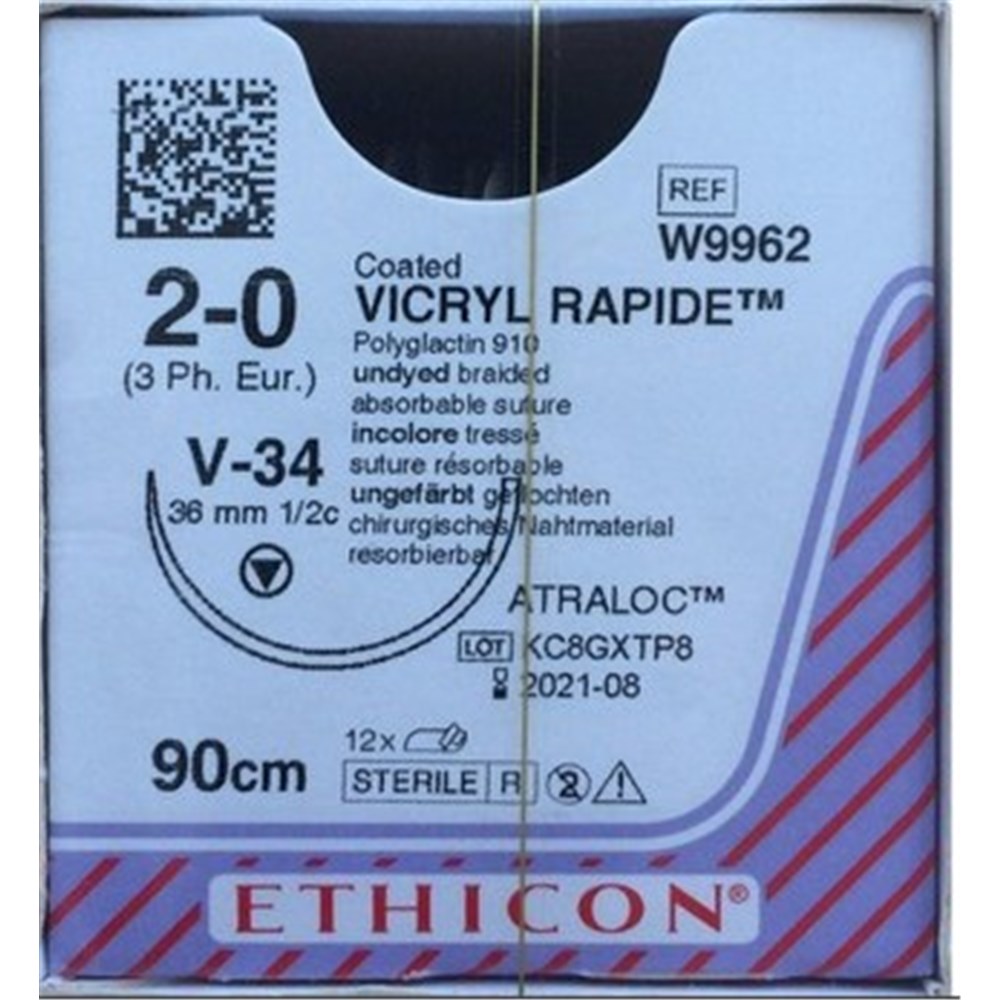 Ethicon Vicryl Rapide Suture 1/2 Circle TC 2/0 V-34 36mm 90cm