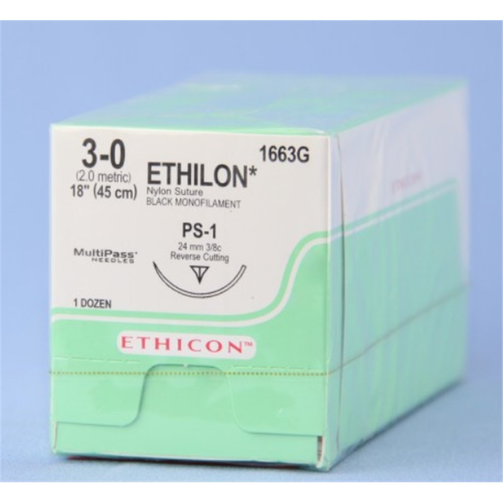Johnson & Johnson Suture Ethicon Nylon, 3/0, 24mm, FS1, 3/8 Circle Reverse Cut, 12-Pack