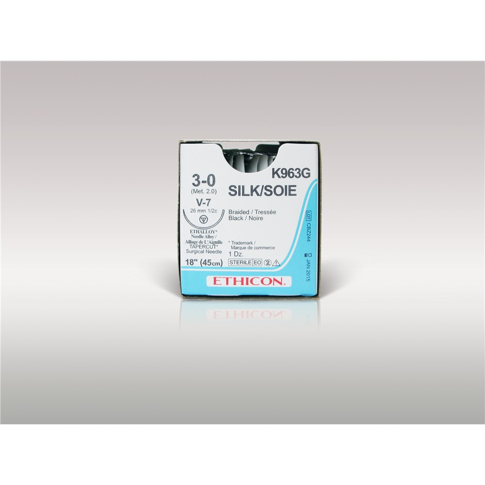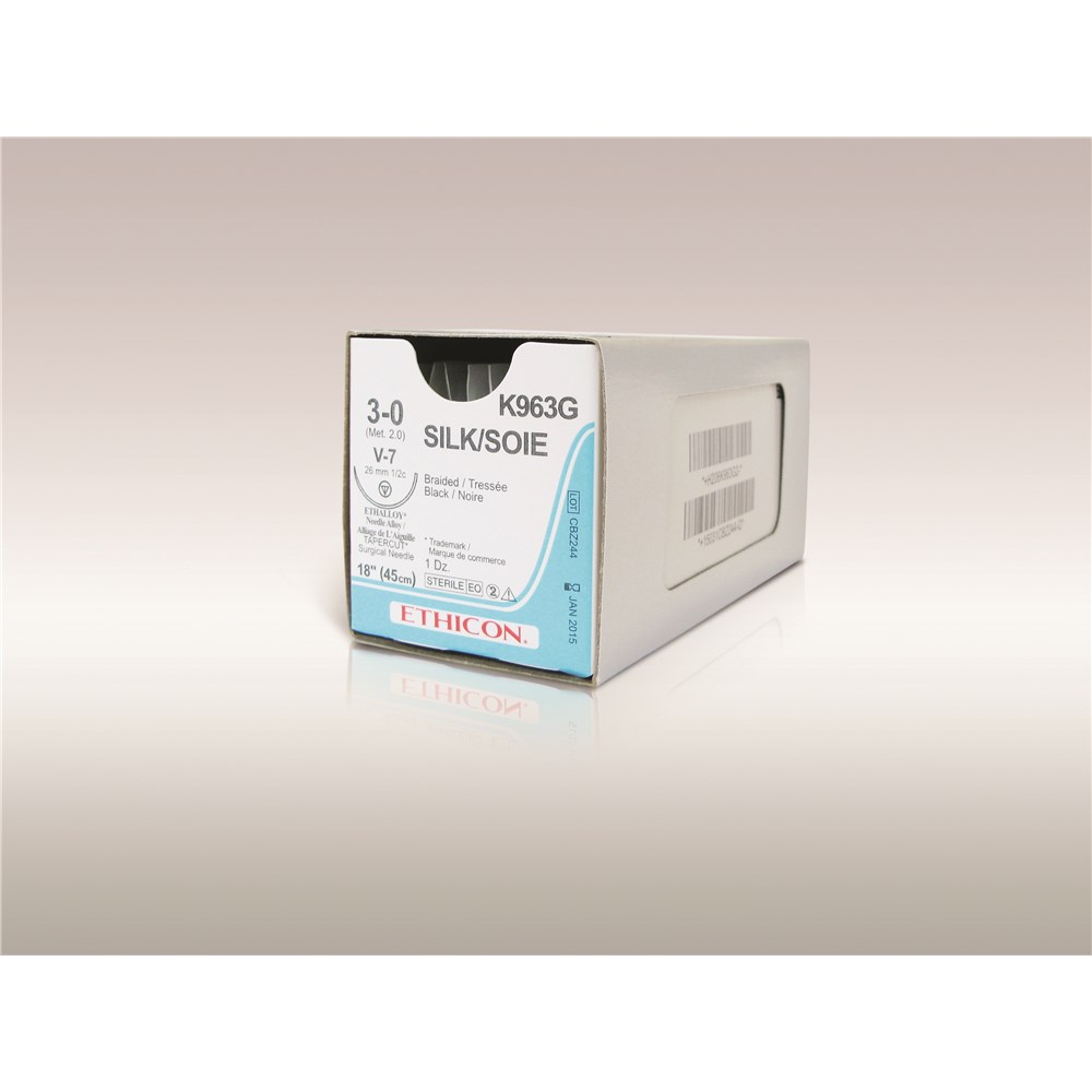 Johnson & Johnson Suture Ethicon Silk, 26mm, 3/0, V7, 1/2 Circle Taper Cut, 12-Pack