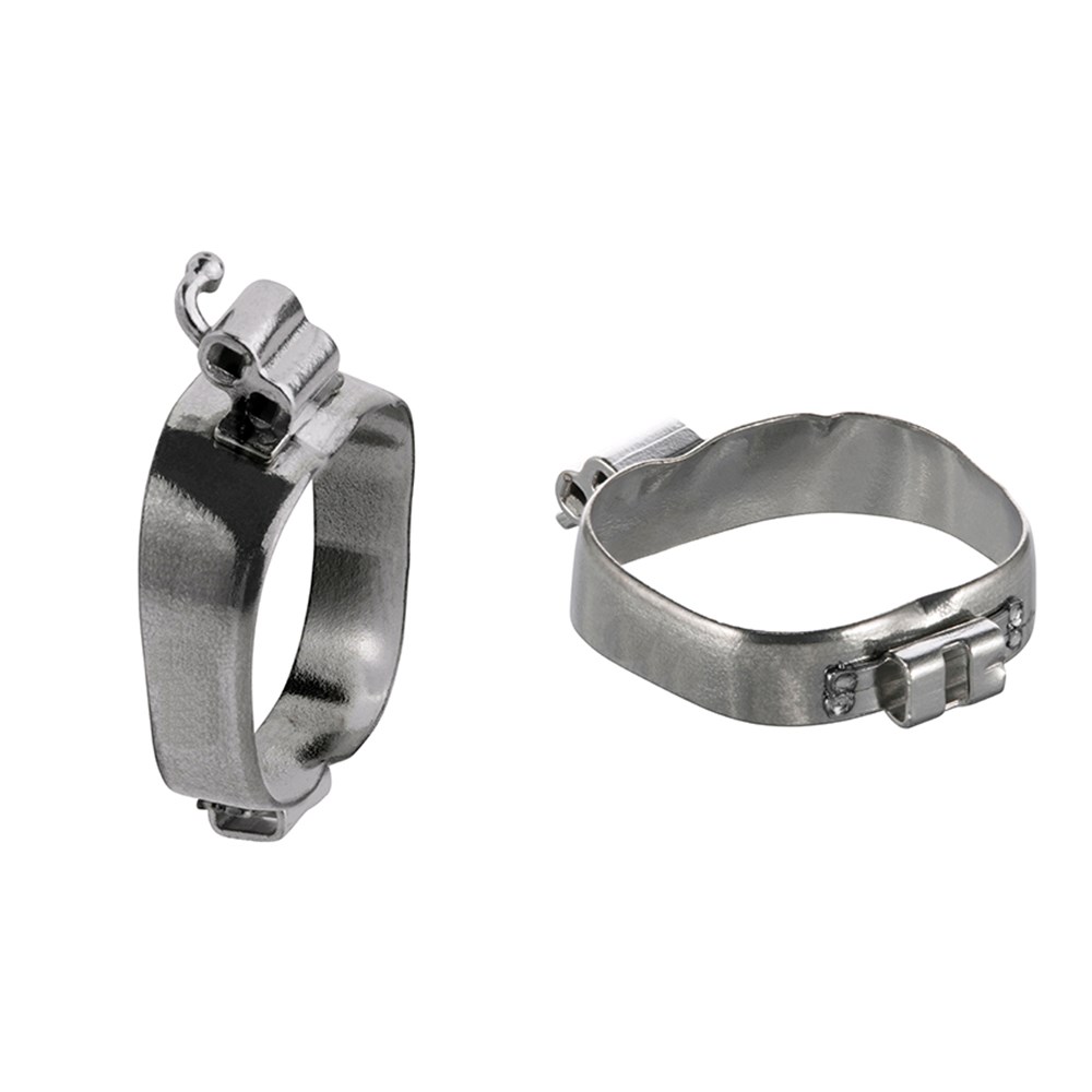 Superior tooth morphology bands with memory and elasticity maintained after prefit and removal. Increased occlusal edge strength to prevent deformation. Stiffer material to withstand additional pressure of extra oral and intra oral appliances. Full Tempered. Available with micro-etched interiors for maximum retention. Sizes from 29.5-44. Pack of 3.