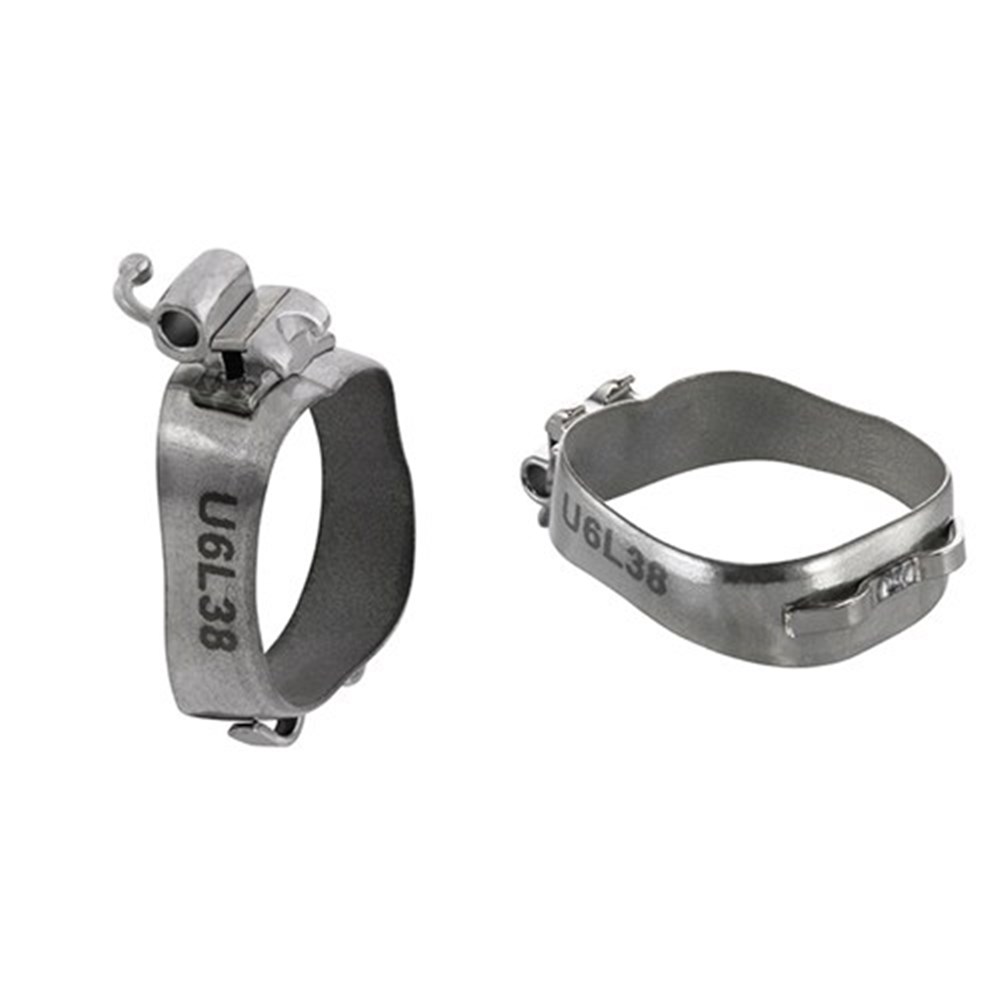 Superior tooth morphology bands with memory and elasticity maintained after prefit and removal. Increased occlusal edge strength to prevent deformation. Stiffer material to withstand additional pressure of extra oral and intra oral appliances. Full Tempered. Available with micro-etched interiors for maximum retention. Sizes from 29.5-44. Pack of 3.