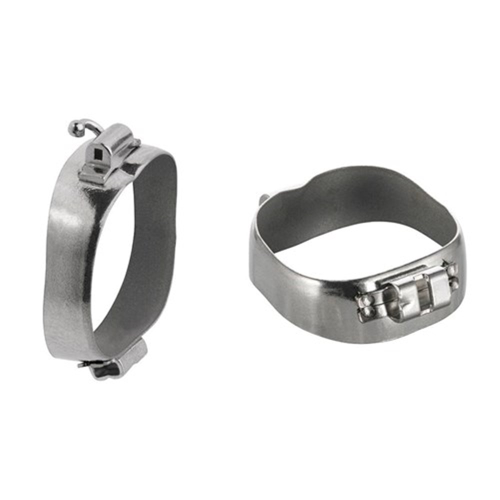 Superior tooth morphology bands with memory and elasticity maintained after prefit and removal. Increased occlusal edge strength to prevent deformation. Stiffer material to withstand additional pressure of extra oral and intra oral appliances. Full Tempered. Available with micro-etched interiors for maximum retention. Sizes from 29.5-44. Pack of 3.