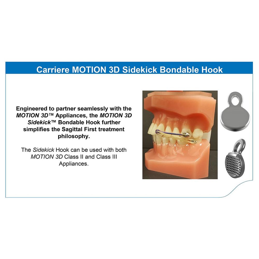 Engineered to partner seamlessly with the MOTION 3D™ Appliances, the MOTION 3D Sidekick™ Bondable Hook further simplifies the Sagittal First treatment philosophy. The Sidekick Hook can be used with both MOTION 3D Class II and Class III Appliances.  Bonded to the mesial cusp of first or second molar.Hook should be positioned/orientated along the same line as the MOTION 3D Appliance hook when the patient is biting down.This placement facilitates easy engagement and superior performance of the MOTION 3D Elastics.The MOTION 3D Sidekick bonding procedure is the same as bonding MOTION 3D Appliances and metal brackets.Features & Benefits:Easy access eyelets allows for versatility during treatment.Increased surface area using pylon geometry offers superior and proven bond strength.Micro-etched base enhances bond strength.1-piece MIM manufacturing process delivers superior strength.Adhesive guard rails provide easier flash cleanup.Chamfered edges enable easy debonding from any angle.Additional Uses:Impacted teeth.Elastic wear with Clear Aligners.Elastic wear to settle the occlusion.Lingually for cross elastics.Pack of 10.