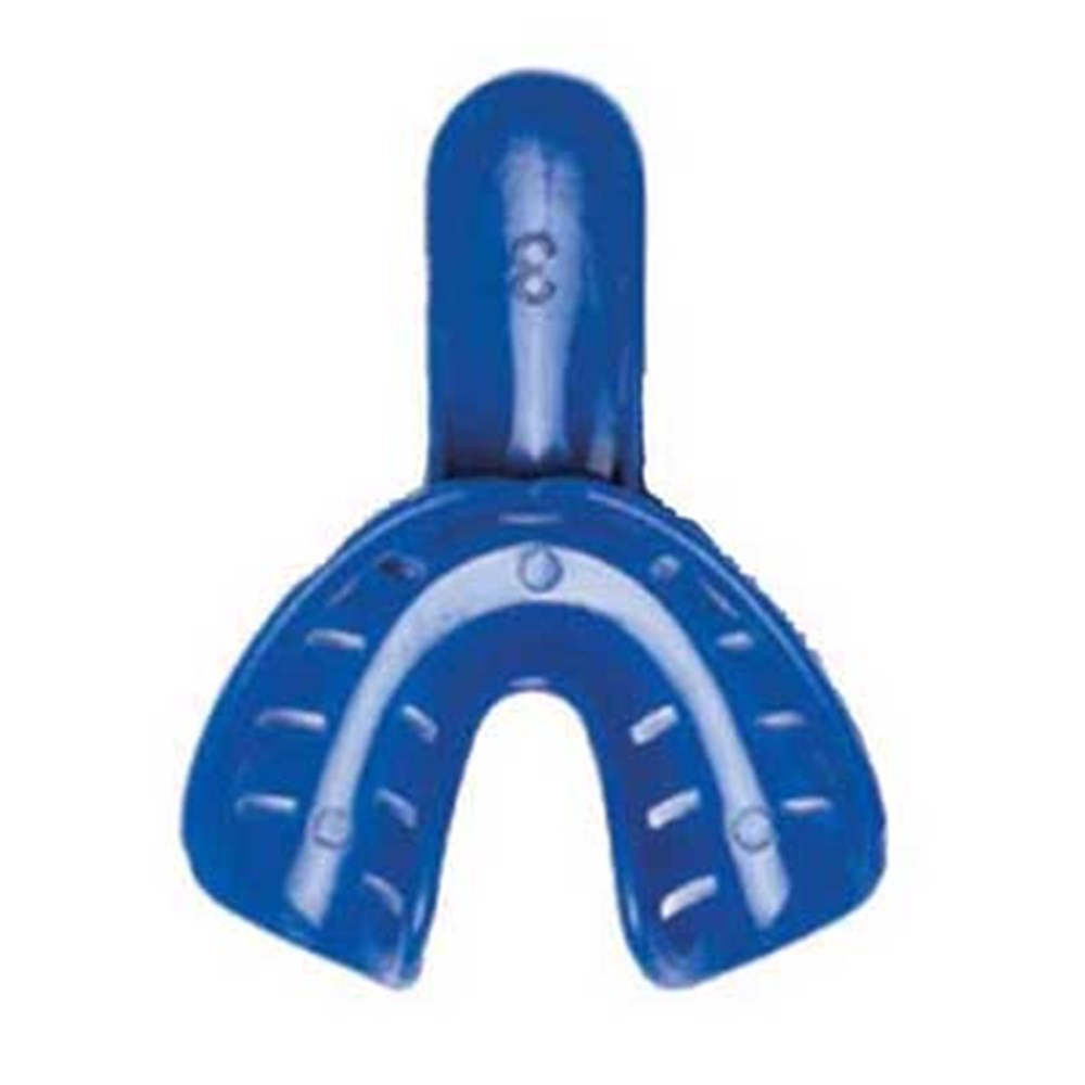Retention Line holds alginate in place.Perforated for alginate retention.Reinforced tab for maximum strength.Rounded edges for patient comfort.Numbered and coloured for easy identification. Bag of 50 – Lower Blue (Child-Large).