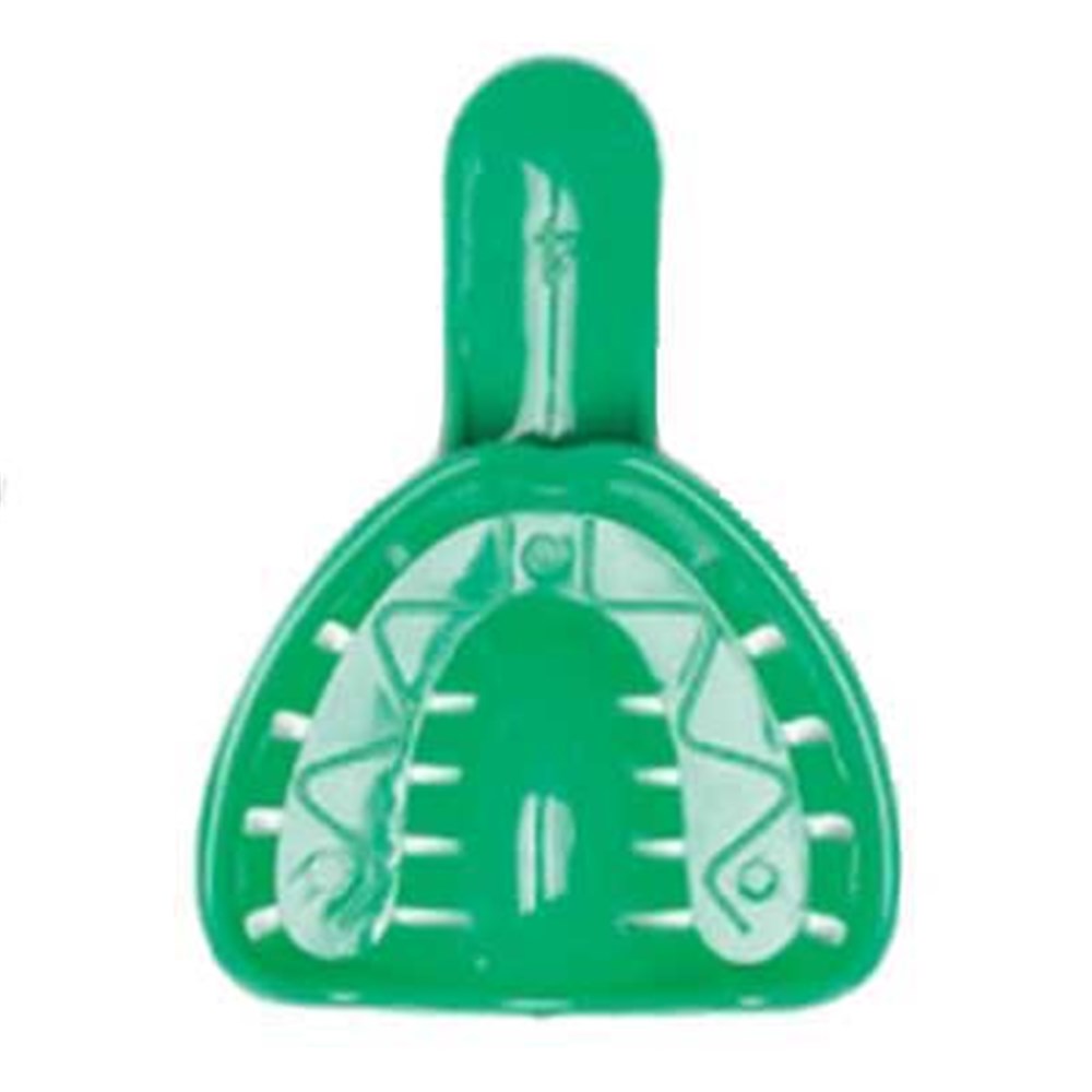 Retention Line holds alginate in place.Perforated for alginate retention.Reinforced tab for maximum strength.Rounded edges for patient comfort.Numbered and coloured for easy identification. Bag of 50 – Upper Green (Adult-Small).