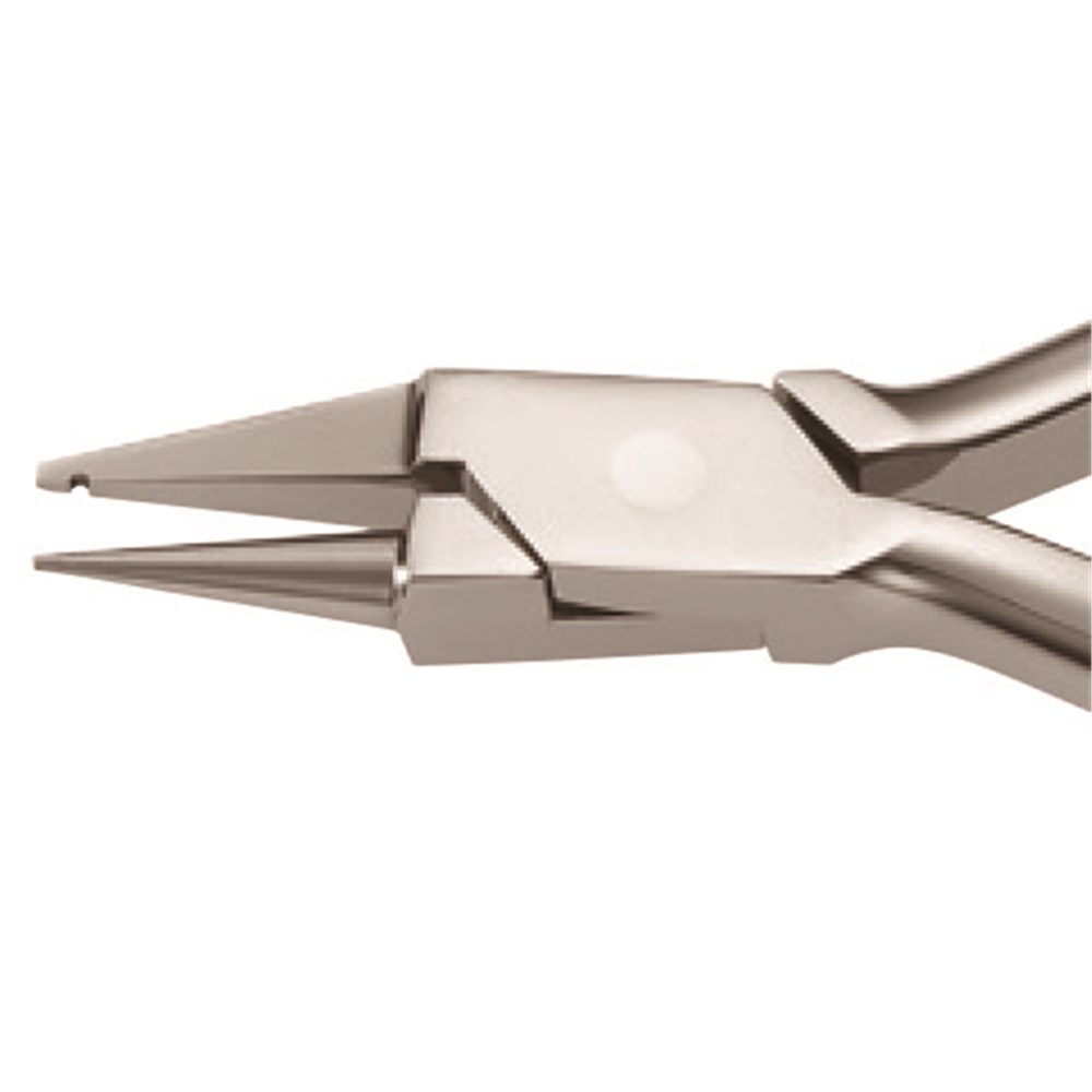 Precision-tapered beaks allow intricate bends and loops in archwires up to .020" (.51mm).  The groove ensures a non-slip grip. Our Endura Plus Pliers have been designed and manufactured with an attention to detail that will assure enhanced performance and longevity.  The care and precision that goes into each and every instrument will ensure a quality you can rely on every time you pick one up.Superior performance stainless steel inserts.Smooth and contoured edges.Reliable flush screw joint.Polished corrosion-resistant finish.Laser-engraved part numbers and applicable wire sizes on handles.