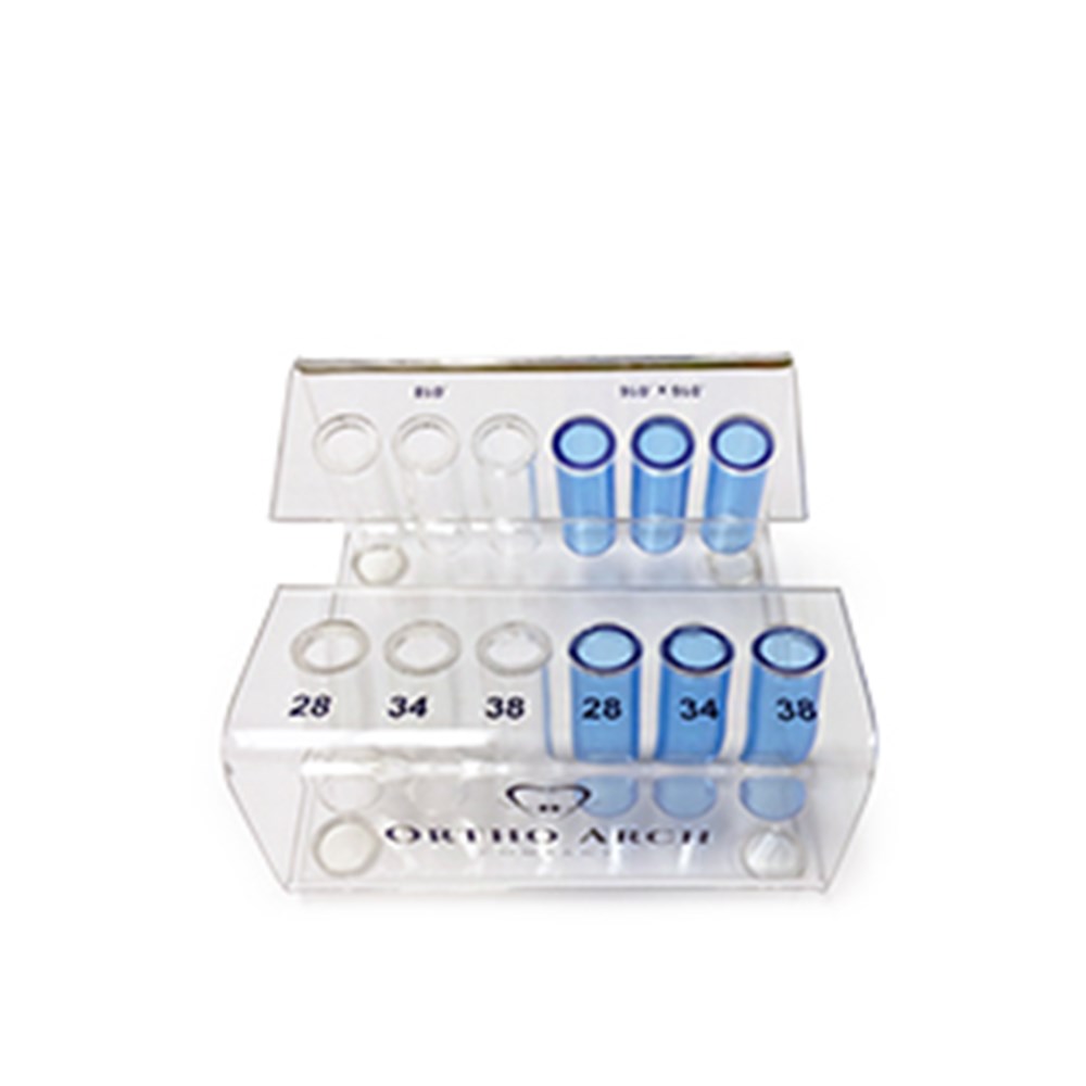 Features 6 rows of tubes and designed to hold Preformed Utility Archwires.  Numbered sizes are: 018 & 016x016 in 28; 34 and 38mm.4" wide X 4" deep x 2 1/2 " tall.   Supplied empty.
