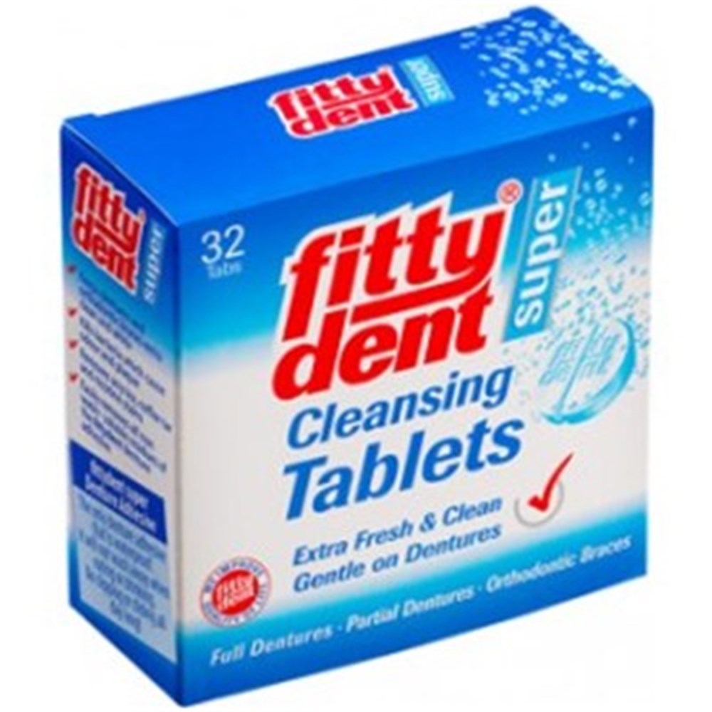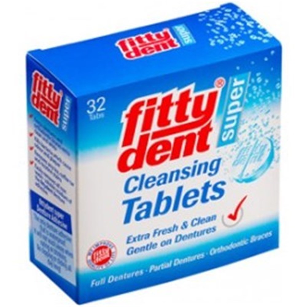 Fifftydents unique formula is insoluble in water so it will not wash out when eating or drinking. Directions: 1) Remove dentures and brush them under running water with a toothbrush. 2) Drop half or one tablet into enough warm water to cover denture or orthodontic brace. 3)Place denture or brace into effervescing. 4) Leave denture or brace into effervescing. 5) Remove and rinse denture or brace under running water. 6) Dry denture thoroughly before applying fittydent denture adhesive or cushions on dentures.