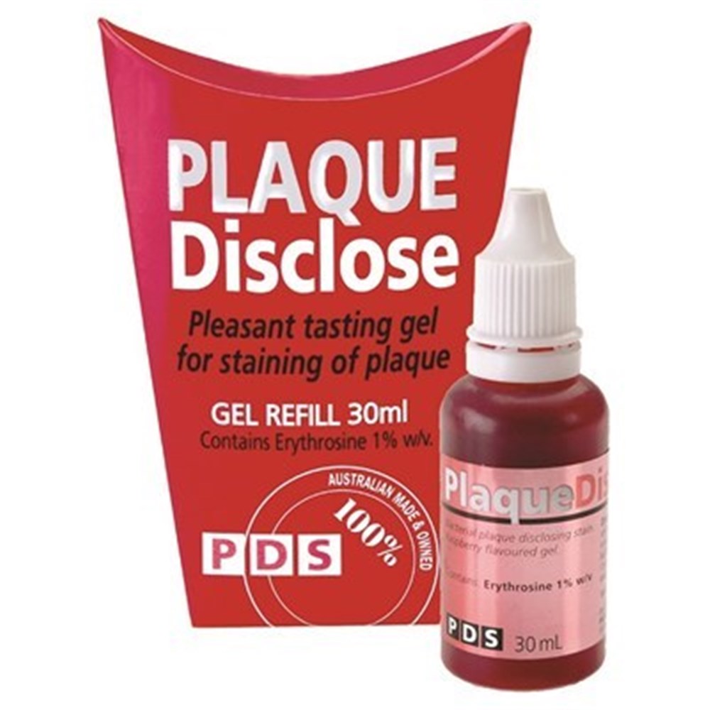 PDS Disclose Raspberry flavoured Disclosing Solution shows plaque that remains on the teeth before/after brushing as red in colour. Plaque Discloe is simple to use, simply place 2-3 drops on the tongue, swirl and spit.