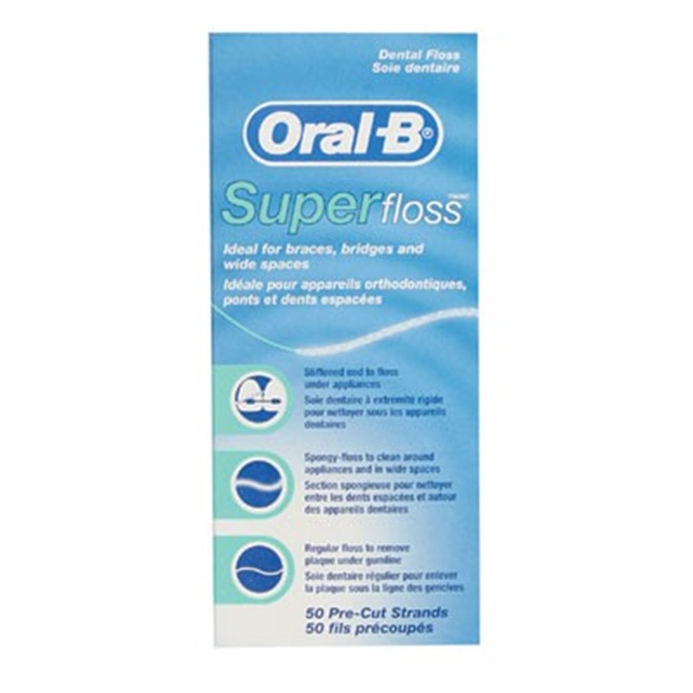 Oral-B Super Floss is ideal for cleaning braces, bridges and wide gaps between teeth. Its three unique components—a stiffened-end dental floss threader, spongy floss and regular floss—all work together for maximum benefits.