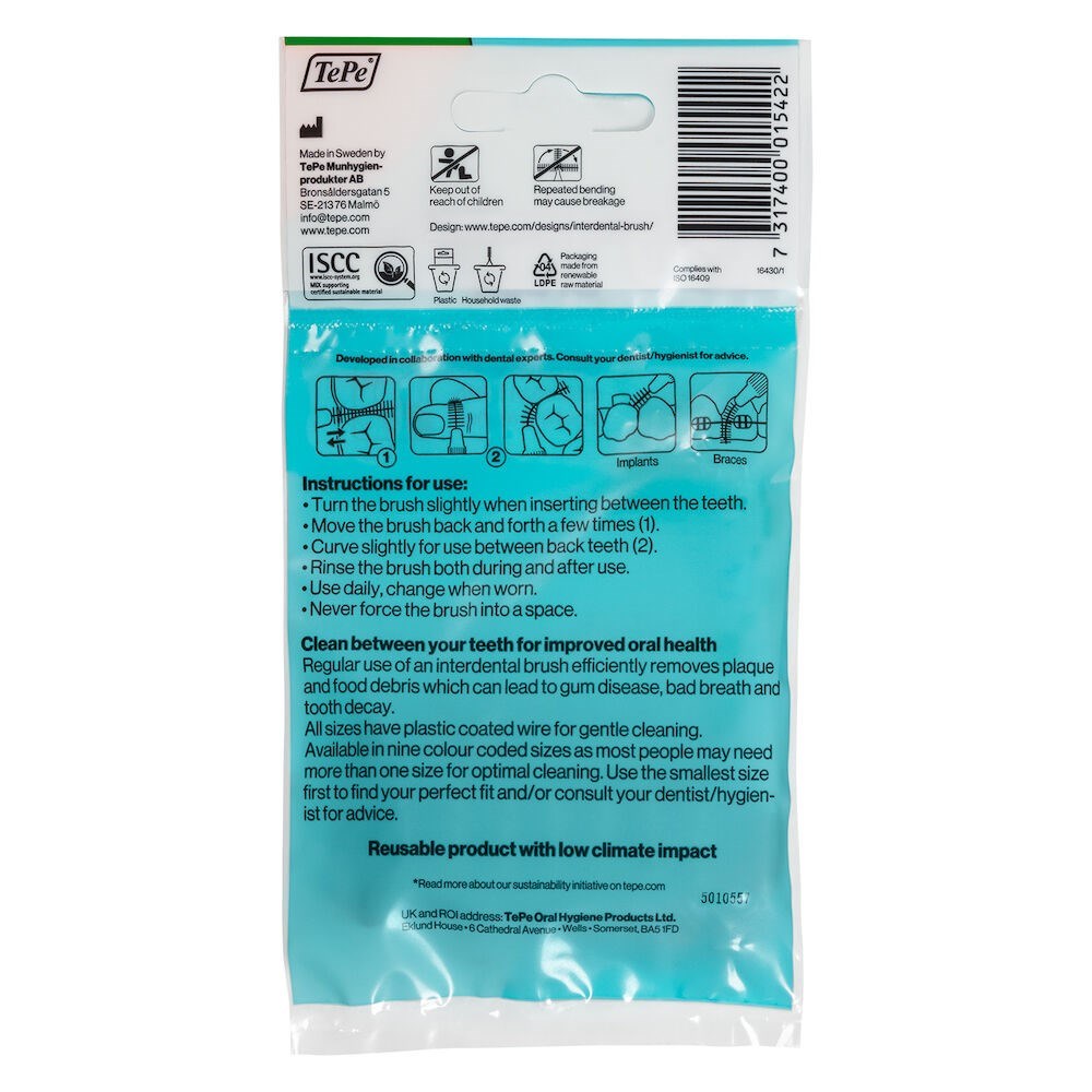 An interdental brush by TePe, designed to clean the gaps between the teeth, where a regular toothbrush is unable to reach. Use daily to keep gums and teeth healthy and fresh. The interdental brush can be used for cleaning between teeth, implants, crowns, and bridges. It's also suitable for cleaning around brackets and wires during orthodontic treatment.