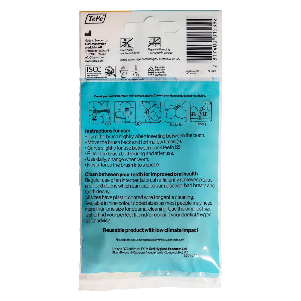 An interdental brush by TePe, designed to clean the gaps between the teeth, where a regular toothbrush is unable to reach. Use daily to keep gums and teeth healthy and fresh. The interdental brush can be used for cleaning between teeth, implants, crowns, and bridges. It's also suitable for cleaning around brackets and wires during orthodontic treatment.