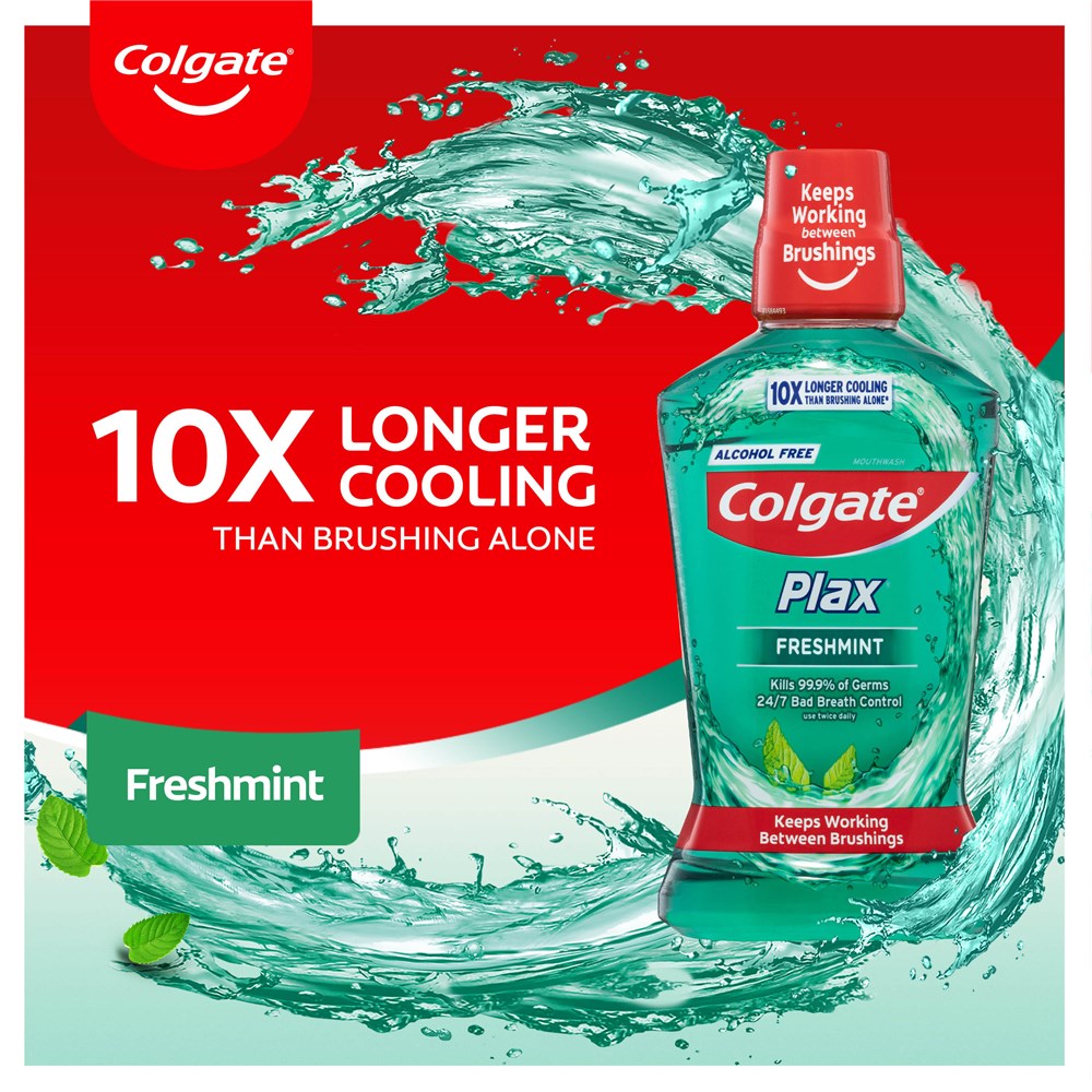 Colgate Plax Antibacterial Alcohol Free Fluoride Mouthwash Freshmint kills up to 99.9% of germs and used twice daily provides 24/7 bad breath control for long lasting freshness.