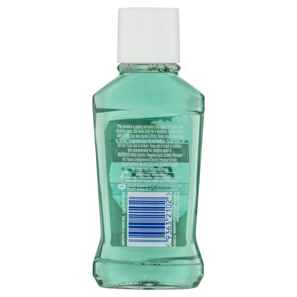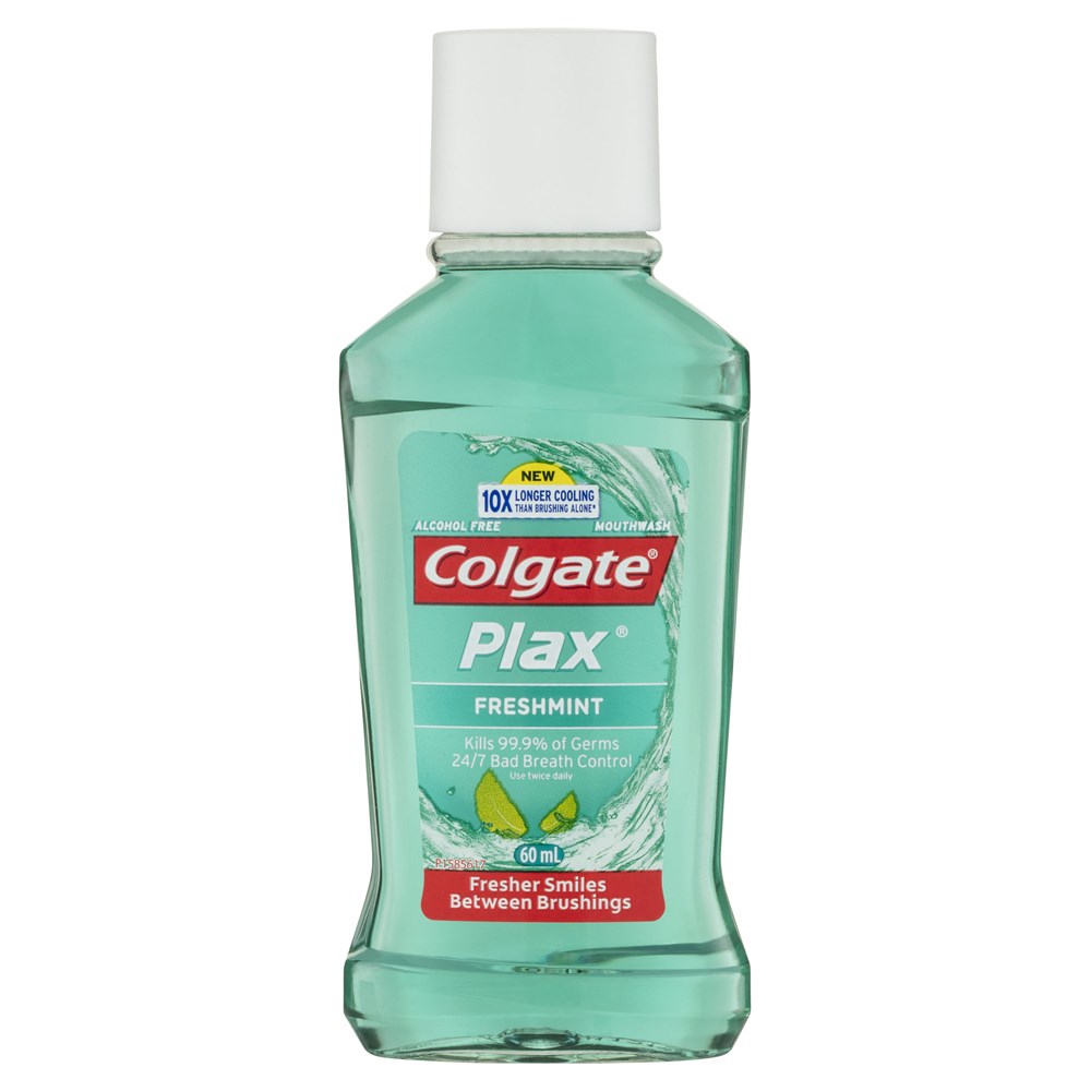 Colgate Plax Antibacterial Alcohol Free Fluoride Mouthwash Freshmint kills up to 99.9% of germs and used twice daily provides 24/7 bad breath control for long lasting freshness. In a convenient travel size mouthwash.