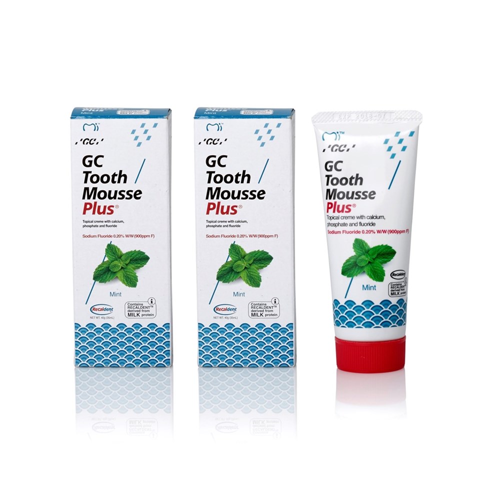 GC Tooth Mousse Plus is a delicious tasting creme containing a milk-derived protein called RECALDENT® with incorporated fluoride (CPP-ACPF: casein phosphopeptide-amorphous calcium phosphate fluoride).