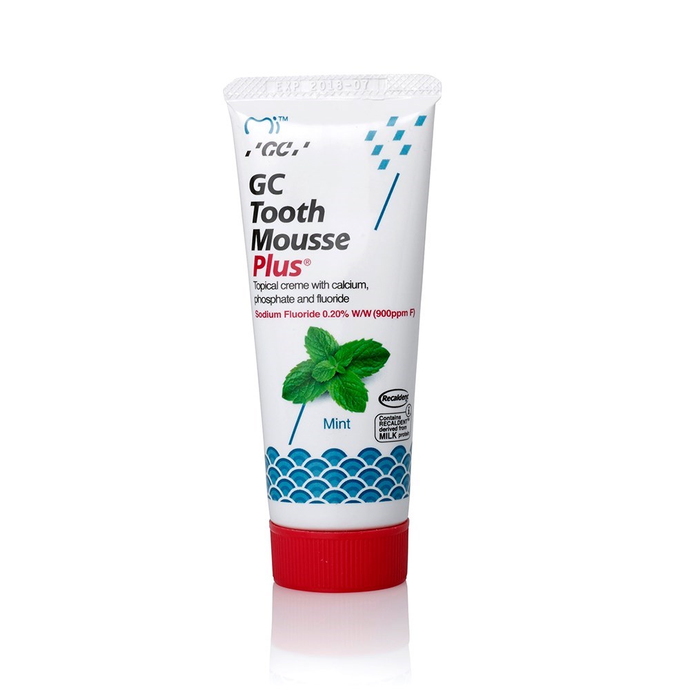 GC Tooth Mousse Plus contains RECALDENT®* (CPP-ACP) which is derived from cow's milk. GC Tooth Mousse Plus also contains hydroxybenzoates. Do not use this product if you have a suspected or proven allergy to milk proteins, benzoate preservatives or soybean derivative. In case of an allergic reaction: stop use, rinse mouth with water and seek medical advice. Contains soybean derived products. Always read the label. Follow the instructions for use. If symptoms persist, talk to your healthcare professional. The overnight home application of GC Tooth Mousse Plus is not recommended for children under the age of 12. Do not swallow GC Tooth Mousse Plus. Do not use except on the advice of a dentist.