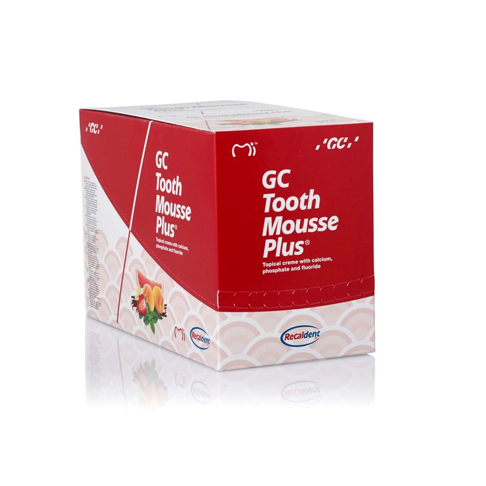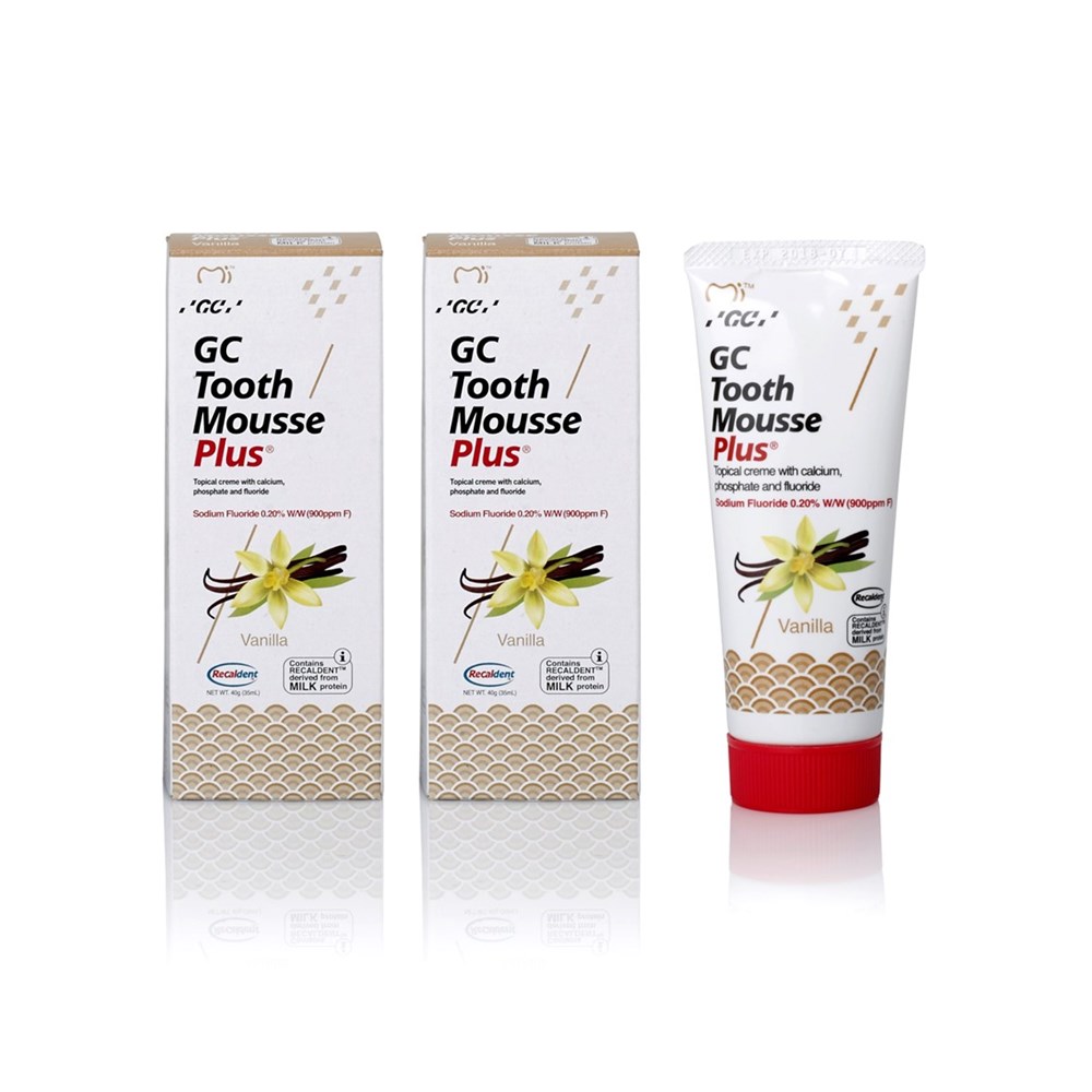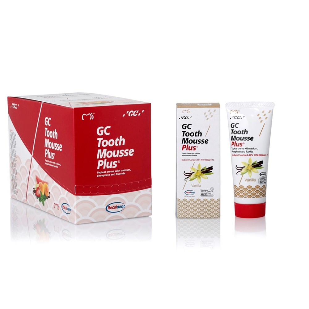 GC Tooth Mousse Plus is a delicious tasting creme containing a milk-derived protein called RECALDENT® with incorporated fluoride (CPP-ACPF: casein phosphopeptide-amorphous calcium phosphate fluoride).