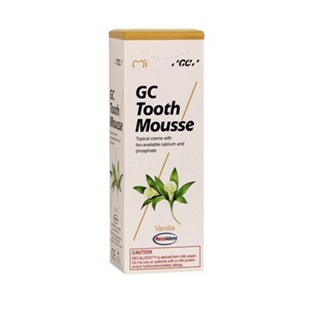 GC Tooth Mousse contains CPP-ACP (RECALDENT) which is derived from cow’s milk. GC Tooth Mousse also contains hydroxybenzoates and soybean products. Do not use this product if you have a suspected or proven allergy to milk proteins, benzoate preservatives or soybean products. In case of an allergic reaction: stop use, rinse mouth with water and seek medical advice. RECALDENT and RECALDENT logo are trademarks of Mondelēz International group used under license.
