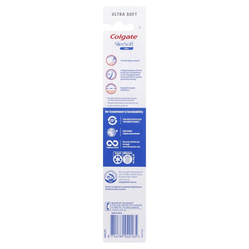 The Colgate® Slim Soft Ortho Toothbrush, with V-Trimmed bristle system, is designed to clean teeth in and around braces.