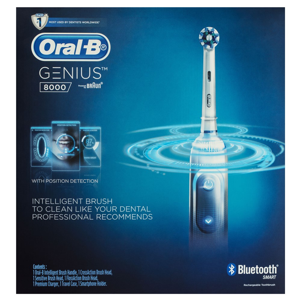 Know you’re getting a superior clean* with the Oral-B GENIUS 8000 electric toothbrush. This highly advanced brush features a dentist-inspired round electric toothbrush head that surrounds and cups each tooth with dynamic oscillating, rotating and pulsating movements to remove up to 100% more plaque than a regular manual toothbrush.