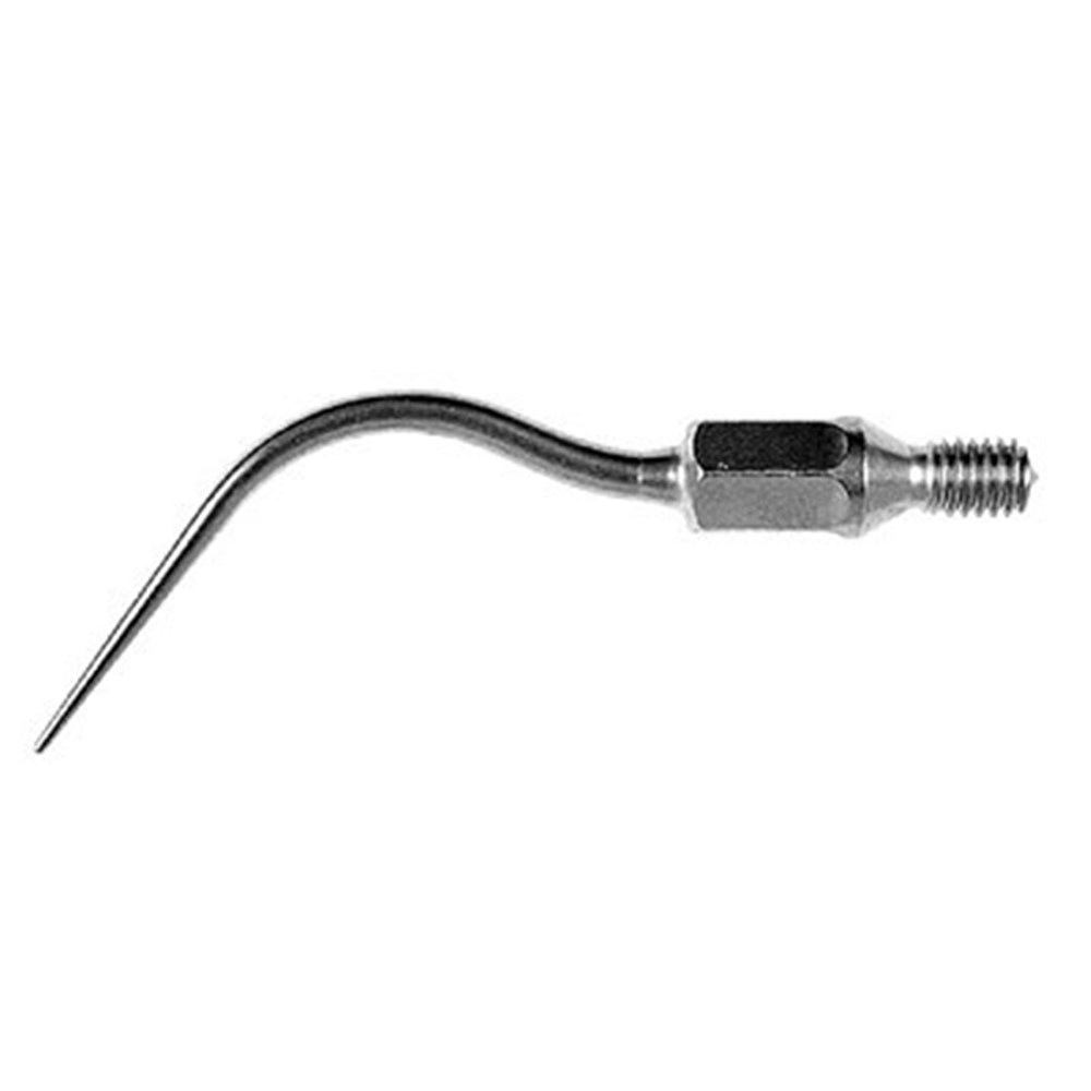 Angled tip used for gentle pocket cleansing during periodontal treatment; effective cleansing in pockets up to 9 mm deep; from second/fourth quadrant to central incisor accessed buccally, then cleansing of front teeth, premolars and molars of the first/third quadrant, accessed palatally / lingually.